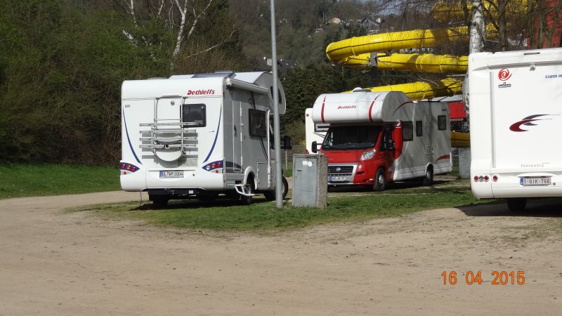 Bei strahlendem Sonnenschein erreichten wir den Wohnmobilstellplatz, der direkt hinter dem Schwimmbad liegt. An der Schwimmbadkasse wird die Stellplatzgebühr bezahlt, der Strom ist im Preis inbegriffen. Für die Entsorgung steht ein Automat an der Ausfahrt zur Verfügung.