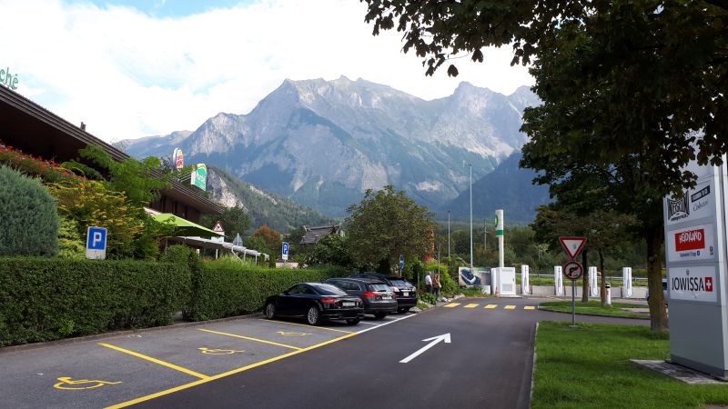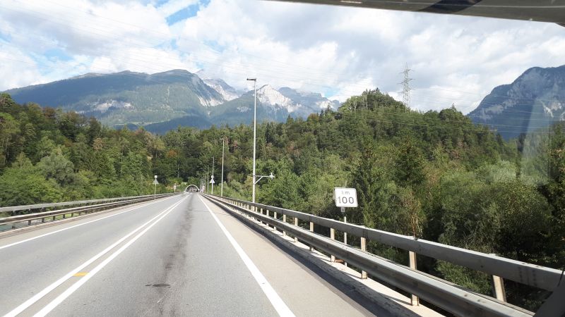 Der Platz enttäuschte auf ganzer Linie. Man sollte pro Stunde 1,5 Euro bezahlen und hatte dafür nichts. Weder Ver- und Entsorgung noch Strom noch einen Blick in schöne Landschaft. Man stand auf einem geschotterten Gelände hinter ein paar Büschen, von einer Felswand und einem Betriebshof umrahmt. Gott sei Dank hatte ich nur einen Parkschein für 2 Stunden gelöst. Sowie wir aus unseren Vorräten etwas gegessen hatten fuhren wir wieder auf die Autobahn. Was ich auf dieser Strecke vermisst habe, waren Möglichkeiten zum Anhalten um Fotos von der Schweizer Bergwelt zu machen. Es ging aber durch sehr viele Tunnel, der längste davon war der Gotthardt-Tunnel mit ca. 17 km.