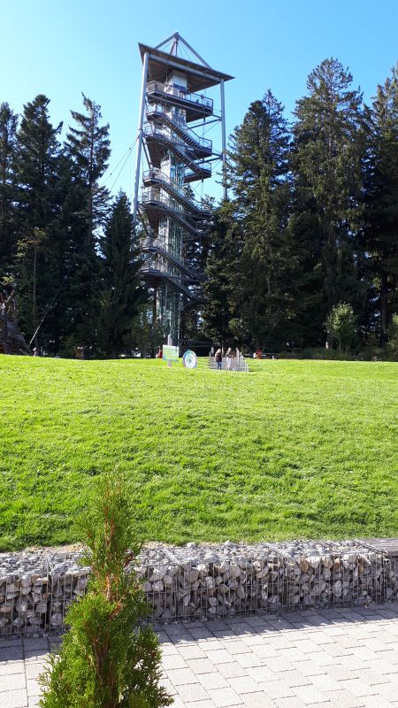Der Skywalk ist ein Aussichtsturm, den man auch mit einem Aufzug bewältigen kann. Von der oberen Plattform gehen mehrere Abzweigungen durch die Baumwipfel. An einem Ende kann man mit einer Rutsche bis nach unten kommen, wir nahmen aber den normalen Weg, der sanft nach unten bis zum Erdboden führt. Drum herum gibt es viele Möglichkeiten zum Wandern, auch an Spielplätze für Kinder wurde gedacht. Wer nach Scheidegg fährt, sollte sich das nicht entgehen lassen.