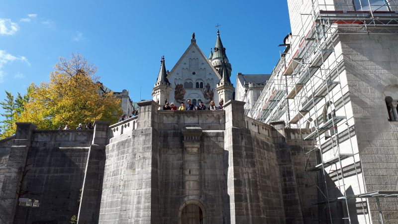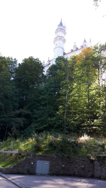 Am nächsten Morgen fuhren wir bereits recht früh los, zunächst nach Schwangau um uns Schloss Neuschwanstein anzusehen. kurz vor 10 waren wir am Schalter um die Eintrittskarten zu lösen. Hier mussten wir uns in eine Schlange einreihen (anstellen ) und hatten eine Wartezeit von fast 1 Stunde. Nachdem wir endlich die Karten erhielten, es war gegen 11 Uhr, konnten wir an der Führung um 12:15 teilnehmen. Bei einem angegebenen Fußweg von ca. 20 -30 Minuten genügend Zeit um zu Fuß den Weg zum Schloss zu gehen. Es ging immer mit einer Steigung von um die 8 ° bergauf. Mit einigen Pausen waren wir dann gegen 11:45 oben. Es war bereits eine Menge los. Jede Führung, die alle 5 Minuten losging, wurde mit einer Nr. angezeigt die auch auf der Karte eingedruckt war. Unsere Nr. wurde exakt um 12:15 an der Tafel angezeigt und die Führung ging endlich los.