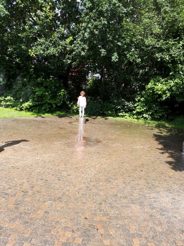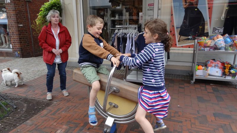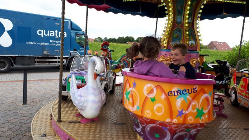 Wir anderen warteten draußen vor dem Schwimmbadgelände. Dort entdeckten wir ein kleines Karussell, und da waren unsere Enkel 5 und 6 Jahre alt direkt begeistert von. Man kann es ihnen auch ansehen.