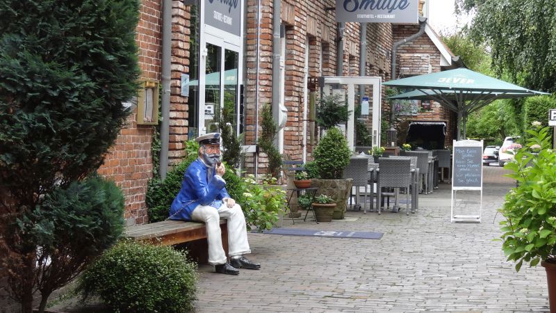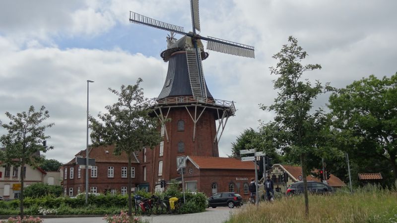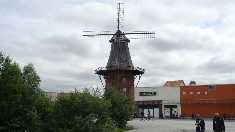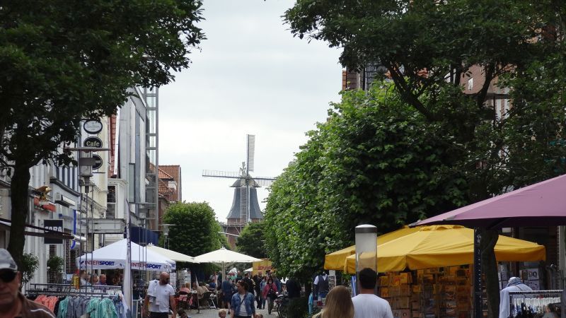 Am nächsten Morgen fuhren wir nach der Stadt Norden. Bei 6 Personen und Hund musste mein Schwiegersohn 2 mal fahren. Wir trafen uns dann am großen Marktpatz, direkt vor dem Rathaus. Durch die Fußgängerzone gingen wir in Richtung der am Horizont zu sehenden Windmühle.