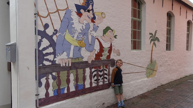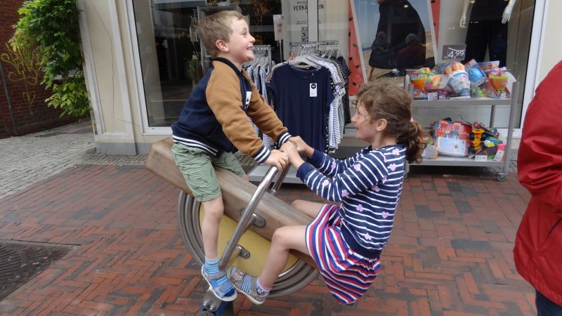Auf dem Rückweg entdeckten unsere Enkel diverse Spielgeräte entlang der Fußgängerzone. Die wurden natürlich ausgiebig getestet. Jonas fand eine Wandmalerei in einer Seitenstraße an der er sich dann fotografieren ließ.