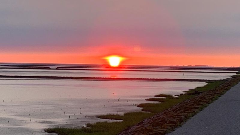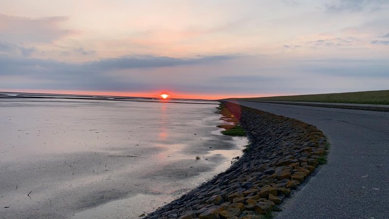 Zum Mittagessen machte ich mit unserer Elektropfanne Pizza Tonno für alle. Der Hund musste auch mal spazieren gehen und so ging ich mit ihm auf den Deich. Von dort schaut man weit ins Wattenmeer. Es gab keine Möglichkeit ans Wasser zur kommen da ein Bauzaun den Weg versperrte. Dieser war notwendig, weil ständig LKw’s und Baumaschinen hin und her fuhren da Norddeich einen neuen Strandabschnitt mit Dünenlandschaft baut.
