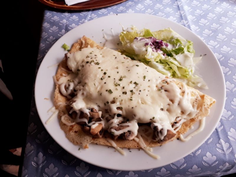 Am besten gefiel uns ein von außen recht unscheinbares Lokal, was sich aber im Innern als ein kleines Prachtstück zeigte. Es war das Lokal “Pfannekuchen”.Hier kann man zwischen 42 verschiedenen Spezialitäten wählen. An manchen plätzen muß man aber auch wegen der vielen Querbalken den Kopf ein wenig einziehen. Und so sah der von mir gewählte Pfannekuchen aus, belegt mit Pilzen und mit Käse überbacken. Einfach nur lecker.