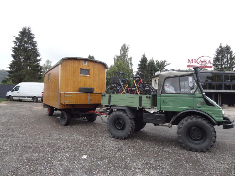 Am späten Nachmittag waren wir wieder in unserem Wohnmobil, als ich das Geräusch eines Traktors hörte. Als ich aus dem Fenster sah, war hinter mir dieser Unimog mit einem Bauwagen als Anhänger, der zum Wohnwagen umgebaut war.