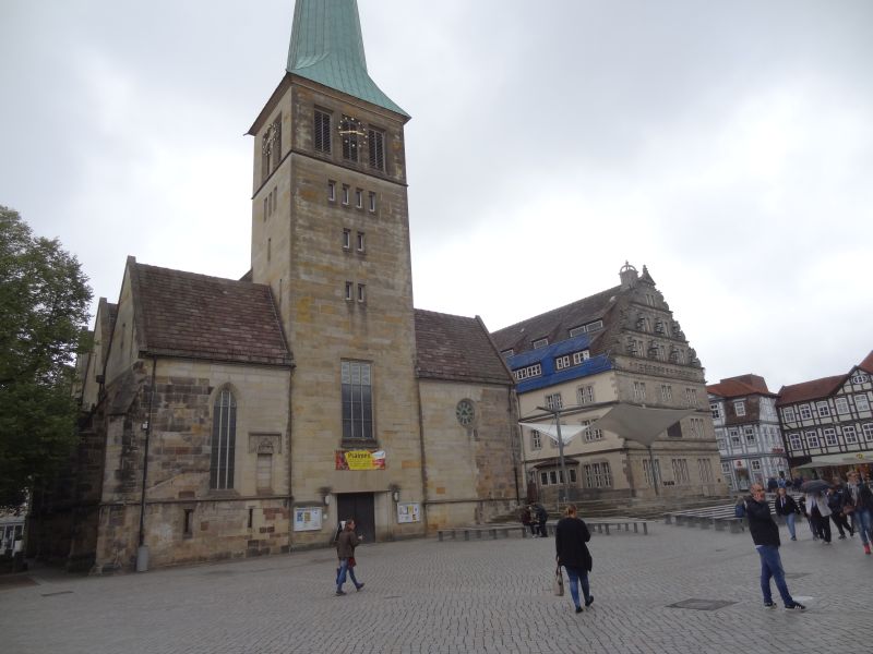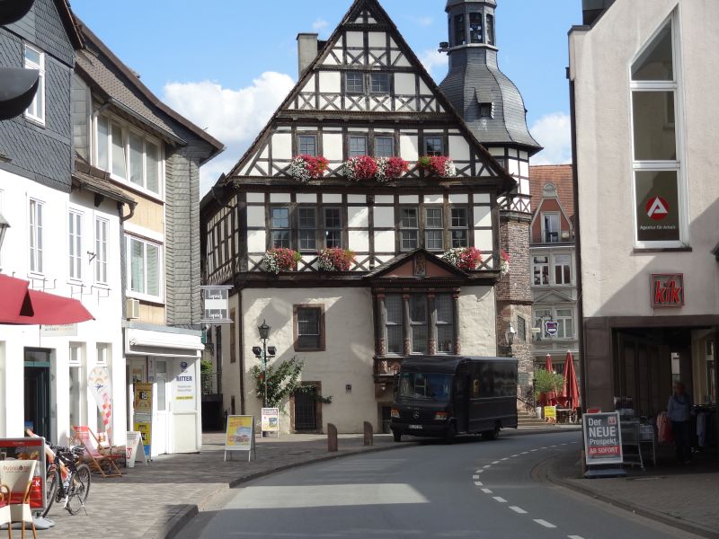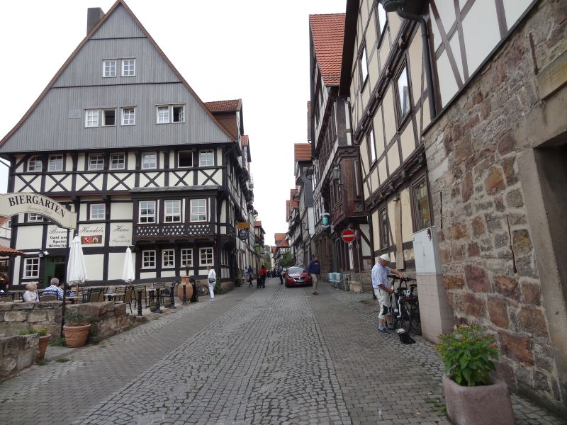 Es war Mittwoch. Und in vielen Städten und Gemeinden ist Mittwoch Markttag. So auch in Höxter. Ein großer Teil der Fußgängerzone war mit Marktständen bestückt, darunter auch einige Imbissstände. Daher war es logisch unser Mittagessen an einem Imbissstand in Form von Currywurst mit Fritten einzunehmen. Hier kamen wir mit einer Frau ins Gespräch der wir dann auch erzählten, dass unsere nächste Station Hameln sei. Bereits hier erfuhren wir, dass die Hauptstrecke nach Hameln wegen Bauarbeiten gesperrt ist und wir deshalb besser über Beverungen nach Hameln fahren sollten. Anschließend ging es ein wenig durch die Altstadt von Höxter. Einige schöne Fachwerkhäuser , zum Teil aus dem 16. Jahrhundert fielen uns auf.