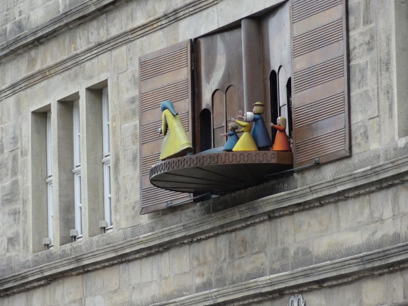 Auf einer Drehscheibe erscheint durch ein geöffnetes Fenster der Rattenfänger und hinter ihm läuft die Schar der Kinder, die dem Rattenfänger folgten.