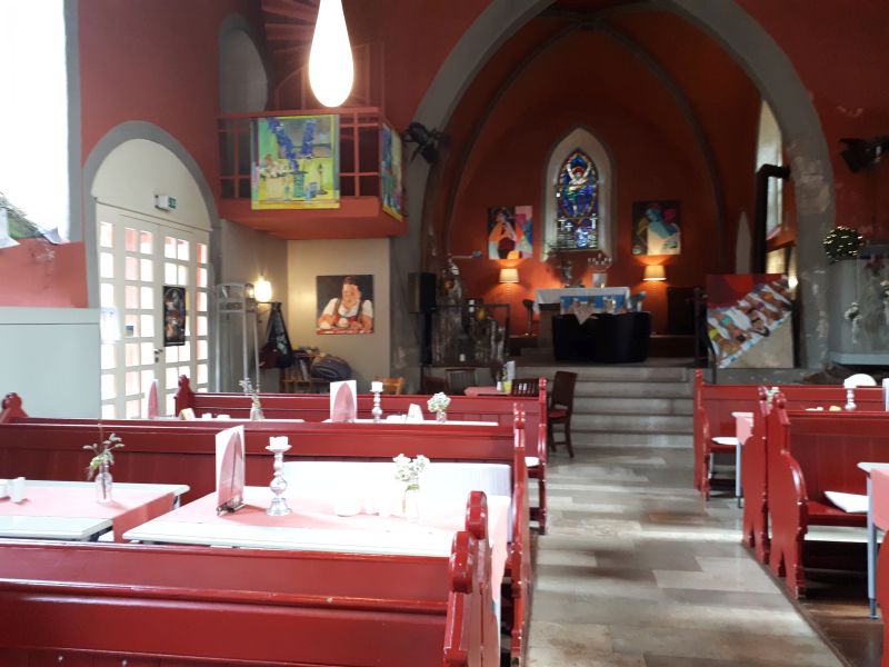 Innerhalb der Kirche befand sich ein Café. Man konnte Kuchen und Eis bestellen, nahm in den rot lackierten Kirchenbänken Platz und war erstaunt über die Wanddekoration mit Bildern einer uns unbekannten Künstlerin. Je länger wir in dem Café waren um so wohler fühlten wir uns.