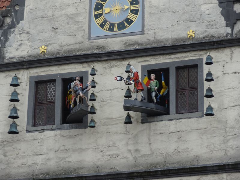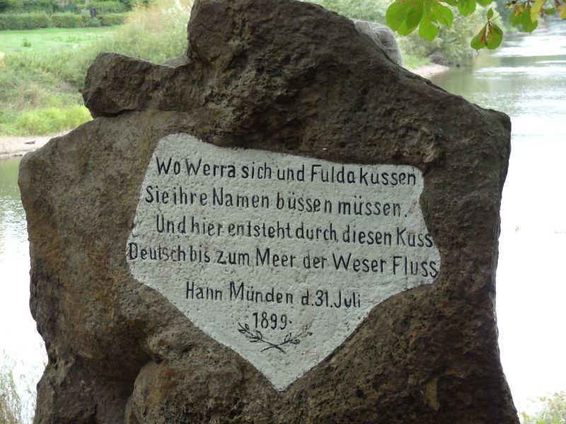 Nachdem ich mich angemeldet hatte, suchte ich mir einen Platz aus – es waren noch etwa 5 Plätze frei -. Abends stellten wir dann fest, dass wir einen von 2 Plätzen erwischt hatten, auf denen kein Satellitenempfang möglich war. Aber vorher gingen wir erst einmal eine kleine Runde. Der Weserstein war unser erster Anlaufpunkt. Von dort gingen wir über die alte Holzbrücke in die Stadt. Als wir am Marktplatz vorbei kamen, fing gerade ein Glockenspiel an. Es war die Melodie vom Lied über Dr. Eisenbart, der hier in Hann.-Münden gelebt, praktiziert und gestorben war. Am Rathaus öffneten sich 2 Fensterflügel und bewegte Figuren stellten die Geschichte von Dr. Eisenbart dar. Hann.Münden ist ja auch ein Teil der Deutschen Märchenstraße und so ist in der Stadt auch häufig die Figur des Dr. Eisenbart zu sehen. Und trotz des Spottliedes über den Arzt, der Blinde wieder gehen und Lahme wieder sehen läßt, soll es sich um einen für seine Zeit sehr guten Arzt gehandelt haben. Das Stadtbild wird durch Fachwerkhäuser geprägt. und obwohl es Sonntag war (oder gerade deswegen) war reger Betrieb in der Stadt und einige Läden hatten geöffnet. Da wir den Montag auch noch für Hann.-Münden eingeplant hatten, gingen wir nach dieser ersten Orientierung wieder zurück zum Wohnmobil. Die Nachbarn zur rechten hatten inzwischen den Platz gewechselt. Die zur linken saßen jetzt draußen . Die Plätze waren breit genug um die Markise auszufahren und Tisch und Stühle herauszustellen. Nach ein paar höflichen Worten zur Begrüßung fing die Frau an zu erzählen und es war äußerst schwierig sie zu stoppen ohne unhöflich zu sein. Nach ein paar Minuten kannten wir fast die gesamte Lebensgeschichte. Am nächsten Morgen stellten wir uns 3 Plätze weiter nach hinten und hatten dann auch Satellitenempfang. Als wir das unserer Nachbarin sagten, fragte Sie direkt „Aber ihr wechselt doch nicht wegen uns“ natürlich nicht antwortete ich Ihr, es geht nur um den Satellitenempfang.