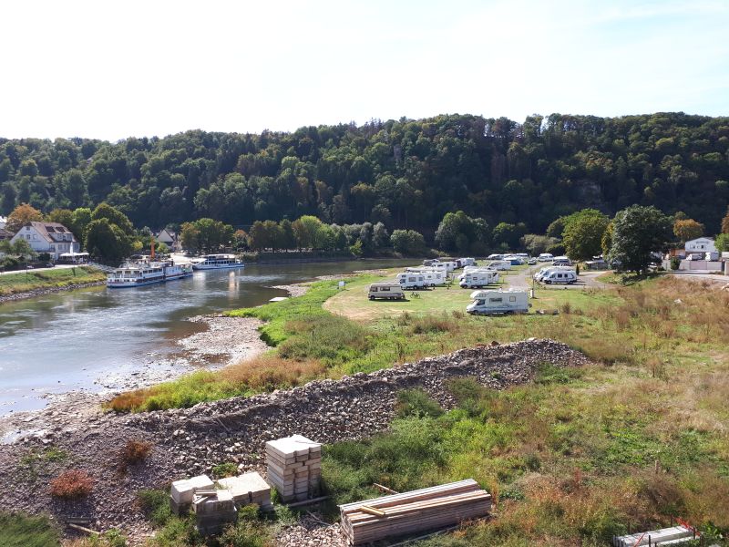 Der Stellplatz liegt auf einer Wiese vor dem Campingplatz mit Blick auf die Weser. Die Fahrgastschiffe liegen auf der anderen Seite; können aber wegen des niedrigen Wasserstandes nicht fahren. Somit ist eine Schiffstour auf der Weser zur Zeit nicht möglich. Nachdem wir unseren Stellplatz ausgesucht und uns beider Rezeption angemeldet hatten, schauten wir uns Bad Karlshafen an.