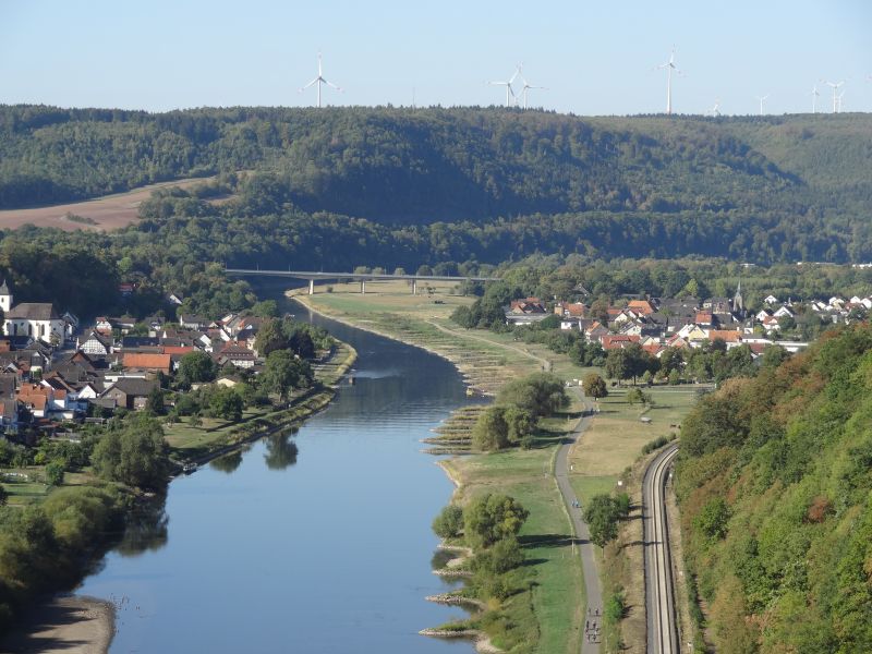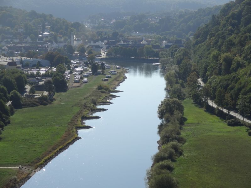 Mittwoch, 12.9.2018 Kurz hinter Bad Karlshafen kommt man an den Weser Sky-walk. Man riet uns davon ab mit dem Auto hochzufahren weil die Straße sehr schmal sei und mit Lkw‘s als Gegenverkehr zu rechnen sei. Es sei besser, diesen zu Fuß zu erreichen. Ich hatte keine Lust 3,5 km nur wegen eines Aussichtspunktes zu gehen. Man muß die ja auch zurück laufen und dann sind es schon 7 km. Also hakten wir den Weser Sky-walk ab und gaben in unser Navi das nächste Ziel – Höxter – ein.Wir fuhren also los und ,große Überraschung, es war genau die schmale Straße die zum Sky-walk führte, die das Navi als beste Verbindung vorschlug. Das erkannten wir aber erst als wir bereits am Parkplatz des Steinbruch ankamen, der vor dem Sky-walk liegt und dort das Hinweisschild sahen „Sky-walk 0,5 km“ sahen. Wir gingen also doch zum Sky-walk und schauten auf die Weser hinab. Selbst unser Stellplatz war zu erkennen. Für diese Aussicht hat sich der Weg gelohnt. Allerdings kann man auch bis zum Fußweg, der zu Sky-walk führt, fahren und dort parken. Man hat dann nur 300 m durch den Wald zu laufen. Die Straße war zwar schmal, ich hatte aber keine Bedenken dass wir in Schwierigkeiten kommen wenn ein LKW entgegenkommt. Man sollte halt dementsprechend um die uneinsehbaren Kurven langsam machen.