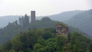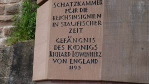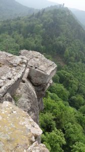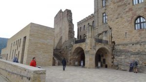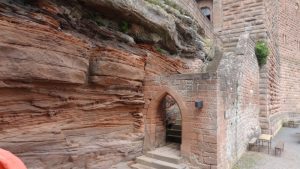 Zurück am Weingut kehrten wir noch in der Straußwirtschaft ein um noch etwas Wein zu kaufen. Eine nette Dame stellte uns einige Weine vor und wir probierten auch vieles bevor wir uns entschieden hatten. Dann gaben wir unsere Bestellung auf (natürlich mehr als wir ursprünglich wollten) und gingen dann wieder zu unserem Wohnmobil zurück. Da wir doch einiges an Wein probiert hatten, mußte das Auto stehen bleiben und wir fuhren dann am nächsten Tag weiter. Wir wollten uns die Burg Trifels ansehen. Gegen 10:00 Uhr erreichten wir den Ort Annweiler und fuhren hoch zur Burg Trifels. Ewa 1 km vor der Burg konnte man parken, der Rest mußte erwandert werden. Dabei sieht man wie die Burg richtig auf die vorhandenen Felsen aufgesetzt ist. Die Trifels ist schon ein recht imposantes Bauwerk und die Felsen werden gerne als Übungsgebiet von Kletterern genutzt.