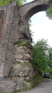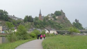 Wir (Ich) wollte unbedingt an die Saarschleife nach Mettlach. Es war Feiertag (der 1. Mai) und so fuhren wir von Primasens über Zweibrücken bis nach Mettlach. Zur Besichtigung der Saarschleife ist ein extra großer Parkplatz sowohl für Pkw’s, als auch Wohnmobile und Busse angelegt. Da jedoch auf dem PKW Parkplatz ein Flohmarkt stattfand, parkten die Besucher die Wohnmobilplätze und auch die Busparkplätze zu. Wir stellten uns auf ein noch freies Plätzchen am Busparkplatz und wühlten uns durch die Menschenmassen durch bis zum Wald um an die Saarschleife zu kommen. Urplötzlich donnerte es gewaltig und heftige Blitze zeigten sich am Himmel. Ein Gewitter war aufgezogen. Also wieder zurück ins Wohnmobil; die Saarschleife gibt es auch noch bei besserem Wetter zu sehen. Als wir am Wohnmobil waren zeigte sich, dass diese Entscheidung richtig war. Inzwischen waren einige Busse angekommen und die Busfahrer fluchten über die zugeparkten Busstellplätze. Wir machten uns auf und davon und fuhren weiter nach Saarburg. Der Wohnmobilstellplatz liegt etwas abseits auf der gegenüberliegenden Seite von Saarburg. Diesen fuhren wir an. Nach einigem Suchen und Rücksprache mit dem Betreiber bekamen wir noch einen freien Platz: Der Platz war sehr gut besucht und die wenigen freien Plätze waren anscheinend reserviert. Wohnmobile, die nach uns kamen, wurden auf ein freies Wiesengelände, direkt an den Stellplatz angrenzend eingewiesen. Wir gingen nun zu Fuß den Fußweg an der Saar entlang bis zur Brücke und dann in die Stadt. Meine Frau hatte vorsichtshalber einen Schirm mitgenommen und ich hatte mir meine vermeintliche dichte Regenjacke angezogen.