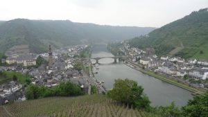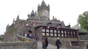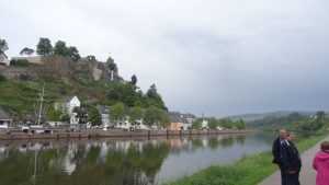 Wir gingen dann durch dieses mittelalterliche Städtchen, dass vom Leukbach durchflossen wird. Mitten in der Stadt ist dann ein ca. 20 m hoher Wasserfall, der früher eine Mühle antrieb. Heute ist es eine der größten Touristenattraktionen Saarburgs. Dementsprechend haben sich um diesen Wasserfall auch Gaststätten, Eisdielen Cafe’s usw. angesiedelt, die alle gut besucht waren. Kaum hatten wir uns einen Platz im Aussenbereich ausgesucht, fing es auch schon zu regnen an. Da wir unter einem großen Schirm saßen, störte uns das wenig. Wir tranken unseren Kaffee, aßen uns einen Apfelstrudel und anschliessend noch ein Eis. Der Regen hatte fast aufgehört und wir gingen durch die Stadt zur Burg. Von Hier hat man natürlich einen herrlichen Blick über die Stadt und die Saar. Selbst unseren Wohnmobilstellplatz konnte man erkennen. Am späten Nachmittag, es hatte wieder zu regnen angefangen, gingen wir zurück. Wir waren gerade auf der Mitte der Brücke, als der Himmel die Schleusen öffnete. Bis wir am Wohnmobil waren, waren wir vollständig durchnäßt. Meine Regenjacke erwies sich als nicht brauchbar, trotz Regenjacke war ich völlig nass geworden. Meine Frau war durch den Schirm zumindest oben etwas besser geschützt, aber auch Sie war ab Gürtellinie völlig nass. Leider blieb das Wetter den ganzen Abend so weiter und wir blieben daher im Wohnmobil. Am nächsten Tag war es dann wieder besser, es war zwar bewölkt, regnete aber nicht mehr. Unsere Absicht war, die Mosel antlangzufahren, in Cochem eine weitere Nacht zu verbringen und dann allmählich wieder nach Haus zu fahren. Gegen 10 Uhr verließen wir den Stellplatz und fuhren an der Saar entlang nach Konz, wo die Saar in die Mosel mündet. Von hier ging es weiter über Trier, die ganze Mosel entlang bis nach Cochem. Fast jeder kleine Ort hat sich auf Wohnmobile eingestellt und bietet entsprechende Stellplätze an, die teilweise sogar zu den besten Stellplätzen in Deutschland zählen. Der Stellplatz in Cochem ist einem Campingplatz angeschloßen. Wir fuhren erst einmal hier vorbei; es war uns aber doch schon zu weit außerhalb und die Stellplätze in Cochem an der Brücke waren alle belegt. Wir fuhren an der Mosel zurück und hier, in Höhe der Schiffsanleger, waren Parkplätze ohne Beschränkungen vorhanden. Die Parkgebühr war nur bis 18:00 Uhr zu entrichten und dann am nächsten Morgen wieder ab 09:00 Uhr. Hier standen wir dann mit unserem Wohnmobil zwar ohne jeglich Versorgung; aber für eine Nacht sollte das wohl gehen. Vor uns stand noch ein Wohnmobil mit Gummersbacher Nr. und der Besitzer erzählte uns, dass er mehrmals im Jahr hier stehen würde ohne irgendwelche Probleme. Nach dieser Auskunft gingen wir beruhigt ins Städtchen. Cochem ist eine ähnlich Touristenhochburg wie Bernkastel-Kues und dementsprechend war auch der Betrieb. Wir wollten unbedingt zur Burg hoch da wir diese noch nie gesehen hatten. Man kann natürlich auch mit dem Auto bis zu einem gewissen Punkt hochfahren. Ob das mit dem Wohnmobil funktioniert hätte, kann ich nicht beurteilen. Oben auf der Burg angekommen mußten wir auf die nächste Führung warten, denn eine Besichtigung ist nur mit Führung möglich. Von der Burg aus hat man auch wieder einen herrlichen Blick über Cochem und ins Moseltal. Im Burgrestaurant aßen wir noch zu Mittag.