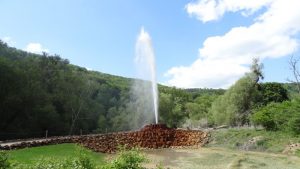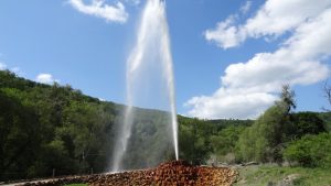 Nach einer Fahrzeit von etwa 1/2 Stunde waren wir dann an der Anlegestelle des Geysiers angekommen. Nach einem kurzen Fußweg standen wir dann vor dem Geysier und warteten auf den nächsten Ausbruch. Man musste wohl schon darauf achten wo man stand um nicht völlig durchnässt zu werden. Auf ein mal schoß eine Wasserfontäne hoch, die immer höher stieg, begleitet von einem kräftigen Rauschen. Die Wasserfontäne erreicht eine Höhe von ca. 60 m als Maximum. Das ganze dauerte einige Minuten und dann fiel der Wasserstrahl wieder in sich zusammen. Ein beeindruckendes Naturschauspiel.