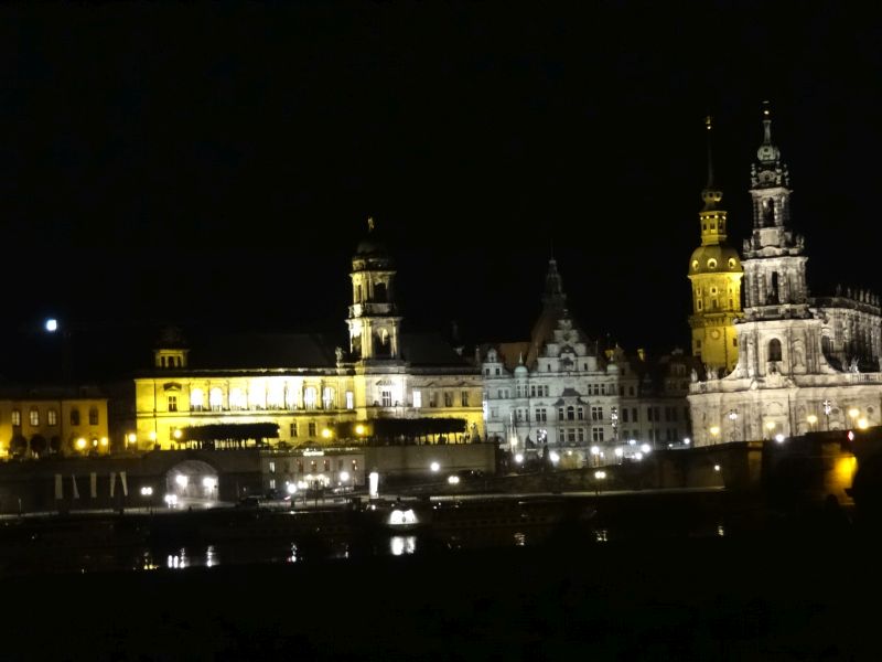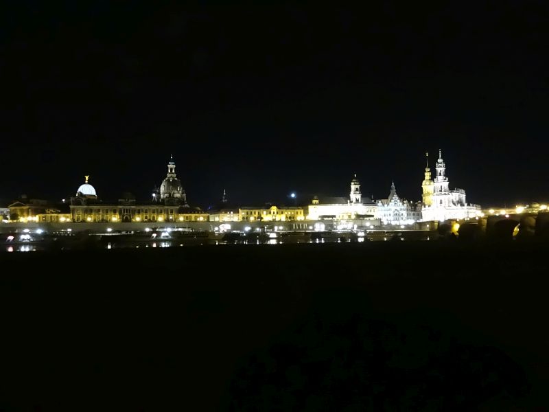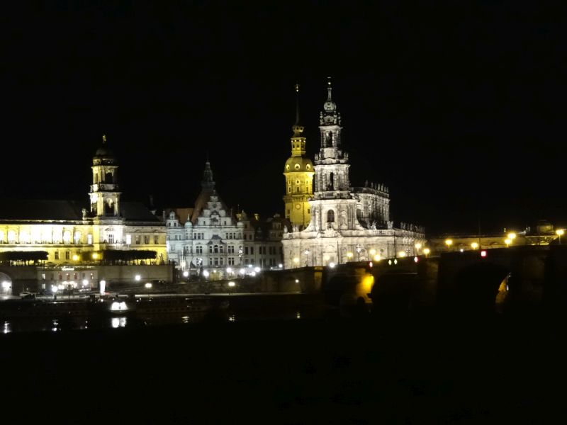 Gegen Abend fiel uns ein massives Polizeiaufgebot auf, dass wir uns zunächst nicht erklären konnten. Dann fiel uns aber ein, dass Montag ist und das Polizeiaufgebot wegen der Pegidademo vorhanden war. Also machten wir uns zurück zu unserem Wohnmobil. Der Stellplatz wurde auch von Pkw’s genutzt und so staunten wir nicht schlecht, als immer mehr Pkw’s kamen und Leute mit Transparenten und selbstgemachten Demo-Schildern ausstiegen um zur Pegida Demo zu gehen. Es blieb aber alles ruhig. Abends ging ich noch mal zur Elbe um das Stadtpanorama zu fotografieren. Es ist einfach ein herrlicher Anblick.