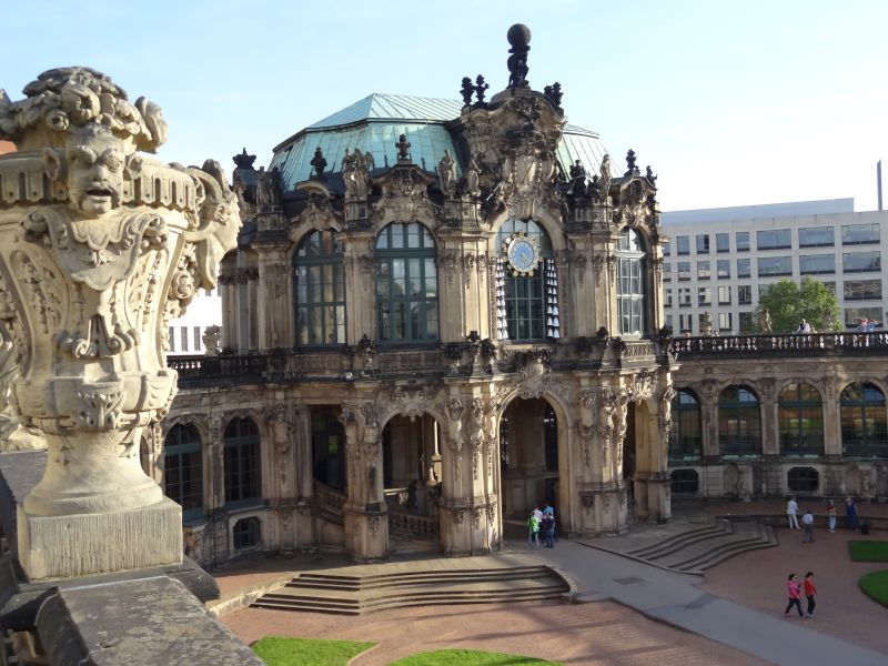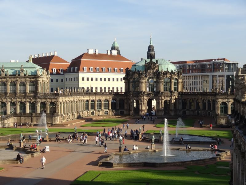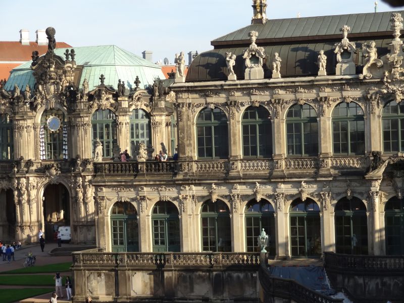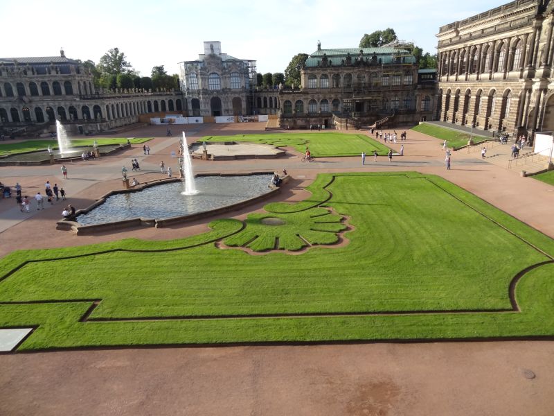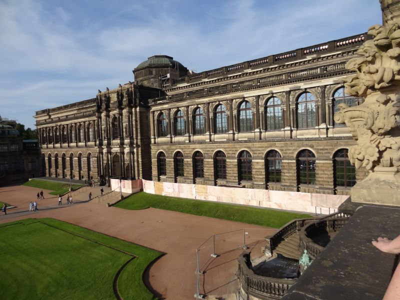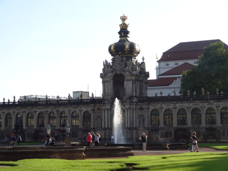 Und dann steht man vor der Semperoper auf dem Theaterplatz. Links davon ist der Zwinger, (bedeutendstes Bauwerk des Spätbarock, Gesamtkunstwerk aus Architektur, Plastik und Malerei. Zitat aus Broschüre „Dresdenreisen“.)