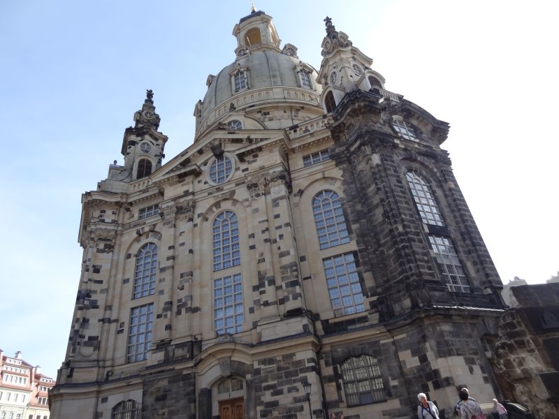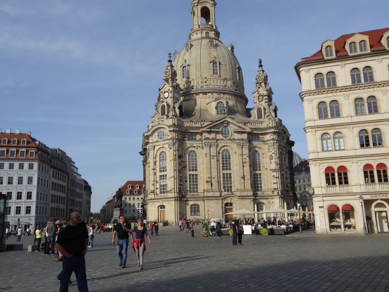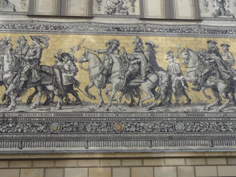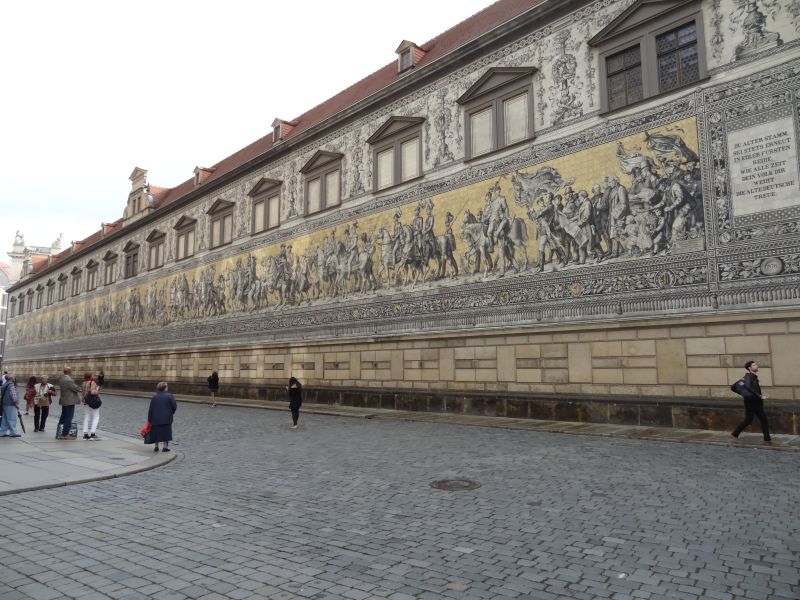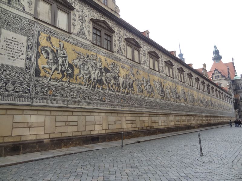 m Schloss ist auch das “grüne Gewölbe”, eine Rekonstruktion der Schatzkammer August des Starken. All diese Gebäude wurden im Februar 1945 völlig zerstört und ab den 50er Jahren wieder aufgebaut. Zuletzt die Frauenkirche, die im Jahre 2005 neu geweiht wurde. Geht man dann den Fürstenzug entlang, kommt man fast unmittelbar an der Frauenkirche und dem großen Marktplatz an. Dazwischen liegen einige Geschäfte und Hotels. Beim Fürstenzug handelt es sich um ein 101 m langes Wandbild aus Meißener Porzellan, wobei die Herrscher des Hauses Wettin als Reiterzug dargestellt werden.