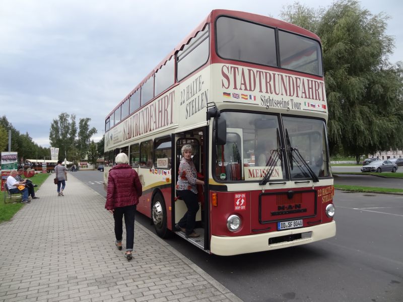 Abends trafen wir auf dem Wohnmobilstellplatz einen Neuankömmling, der auf Stromversorgung angewiesen war. Da alle Anschlüsse besetzt waren, habe ich meinen Anschluss mit ihm geteilt, worüber am nächsten Morgen der Herr vom Stellplatz gar nicht begeistert war. Nun ja für den Strom muss man immerhin eine Tagespauschale von 5 Euro zahlen. Da einige Womos abreisten bekam er nun seinen eigenen Anschluss. Wir blieben eine weitere Nacht, um am nächsten Tag mit dem Bus nach Meisen und Moritzburg zu fahren. Hierzu hatten wir uns bereits an der Haltestelle hinter dem Zwinger Karten gekauft. Die Dame an der Haltestelle versicherte uns, dass der Bus auch hier halten würde, sie müsste den Busfahrer nur telefonisch informieren. Weiter zu Meissen