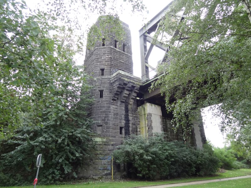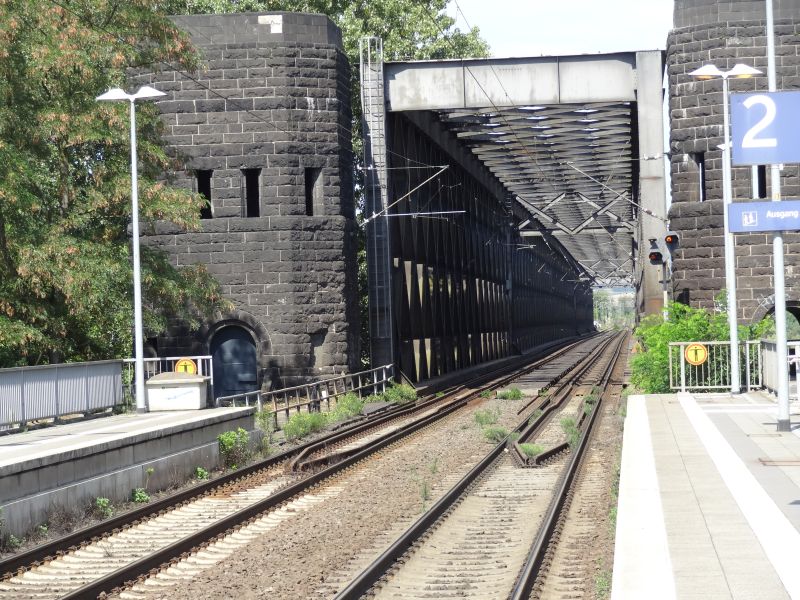Wenn man am Rhein entlang zur Brücke geht, kommt man auch an diesem Brückenkopf vorbei, der eigentlich gut geeignet wäre um Fußgängern die Gelegenheit zum Aufgang zur Brücke zu geben. Aber sowohl Fußgänger, als auch Radfahrer müssen den weiteren Weg über die Zufahrt zur Bahnhaltestelle vor der Brücke nehmen um auf die Brücke zu kommen.