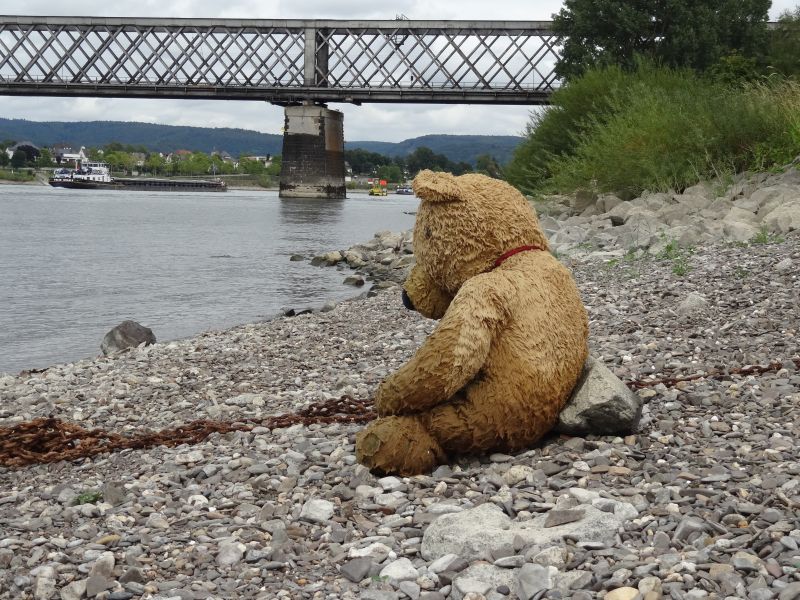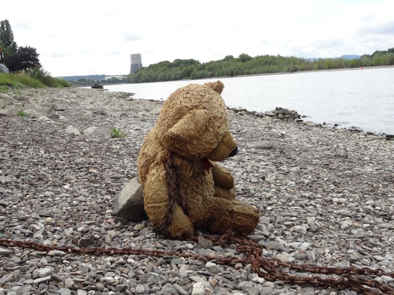 Bei unseren Spaziergängen am Rhein fanden wir auch diesen angeketteten Teddybären. Mit einer Eisenkette um den Hals gelegt sitzt er traurig am Ufer, den Rücken an Steinen angelehnt. Der Rhein hat ihn wohl schon einige Male besucht, den sein Fell hat bereits leicht Anzeichen von Algenbesatz. Ich habe nichts im Internet gefunden um den tieferen Sinn dieses „dem Ertrinken“ preisgegebenen Stofftieres zu erklären. Aber die Symbolik erweckt schon ein Gefühl von Traurigkeit.