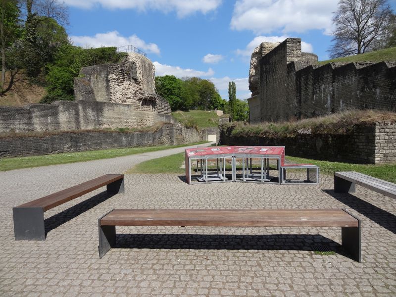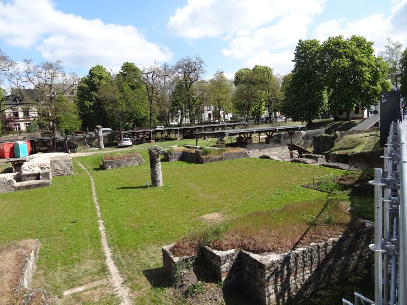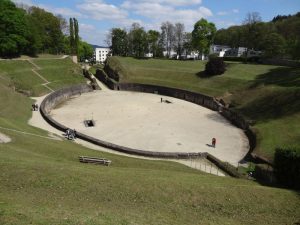 Vom Vorplatz aus ging man über einen aus Metall angelegten Steg einmal quer durchs Gelände und konnte sich die Mauerreste ansehen. Weder meine Frau noch ich gerieten aber in Verzückung über die alten Steine bzw. Mauerreste und so war die Besichtigung der Barbaratherme schnell abgehakt. Der Bus war aber weg und wir überlegten uns statt 20 Minuten auf den nächsten Bus zu warten gehen wir zu Fuß zum nächsten Objekt, dem Amphitheater. Auf dem weg dorthin kamen wir auch an den Kaiserthermen vorbei und wollten erst diese noch besichtigen. Leider wurde der Fußgängerweg ohne Vorankündigung oder Hinweis gesperrt und wir konnten wieder zurück laufen. Jetzt ging es um die Kaisertherme herum zum Eingang. Hier war ich denn doch schon etwas enttäuscht. Als ich vor etwa 50 Jahren in Trier gearbeitet hatte, konnte man vom Palastgarten direkt in die Kaiserthermen gehen und auch durch die unterirdischen Gewölbe laufen, die sich wie ein Labyrinth unter dem Gelände befinden. Heute geht das wohl nicht mehr. Also gingen wir direkt weiter zum Amphitheater.
