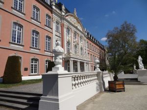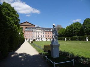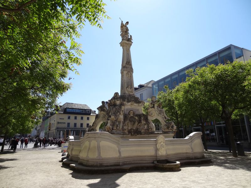 Zum Kaffee trinken wollten wir gerne im Café des Landesmuseums im Palastgarten sein. Auf dem Weg dorthin gingen wir noch in die Konstantin Basilika und am Kurfürstlichen Palais vorbei. Als wir an dem von uns ausgesuchten Café ankamen, war die Terrasse voll. Innen wollten wir nicht sitzen und außen waren nur noch einzelne Plätze an den besetzten Tischen frei. Wir mögen weder beim Campen noch beim Kaffee trinken die Kuschelromantik und gingen deshalb zurück in die Stadt.