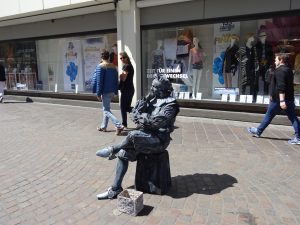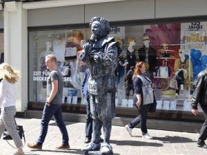 So allmählich hatten wir Hunger und wollten etwas essen. Leider gibt es weder im Amphitheater noch in der näheren Umgebung ein Cafe oder Restaurant wo man hätte hingehen können. Also gingen wir zur Haltestelle des Busses und fuhren zurück in die Innenstadt. Am Porta-Nigra-Platz stiegen wir aus und gingen die Simeonstraße entlang Richtung Hauptmarkt. Hier sahen wir eine Gruppe Figurenkünstler und schauten denen eine Weile zu.