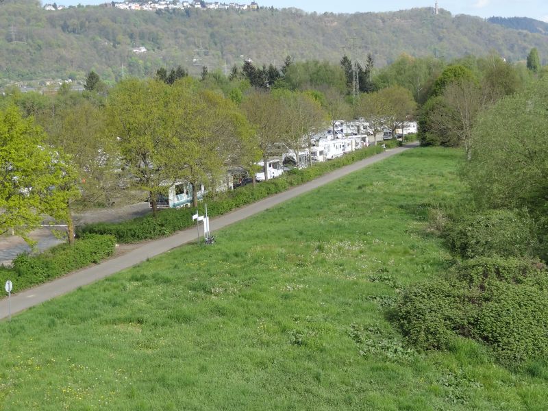 Im linken Bild ist unser Wohnmobil, im rechten Bild der Platz mit Ausgang zum Rad- und Fußgängerweg, der unmittelbar am Rhein entlang führt.