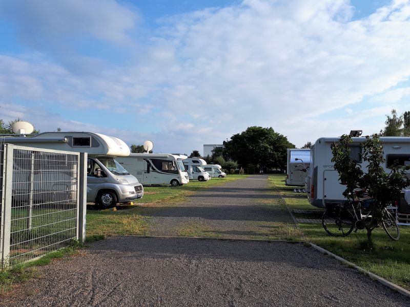 Im linken Bild ist unser Wohnmobil, im rechten Bild der Platz mit Ausgang zum Rad- und Fußgängerweg, der unmittelbar am Rhein entlang führt.