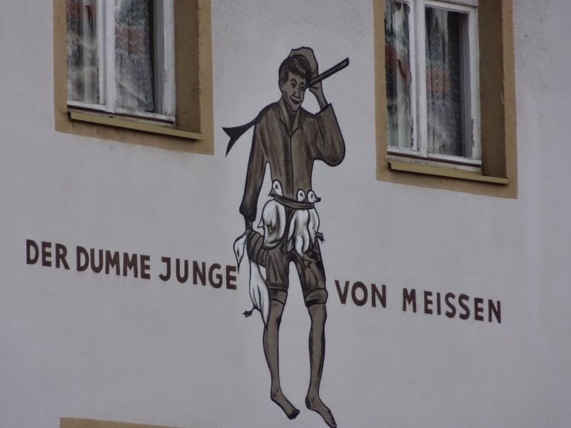 Kurz vor Meissen sind dann auch die ersten Weinberge und Steinbrüche zu sehen. In Meissen angekommen, lies uns der Busfahrer extra wie bereits erwähnt unterhalb des Marktplatzes aussteigen. So hatten wir Gelegenheit ein wenig durch die Stadt zu gehen, während die anderen Fahrgäste zur Porzellanmanufaktur fuhren. Das erste schöne Motiv in Meissen war eine Wandmalerei an der Gerberstraße, die „der dumme Junge von Meissen“ zeigt.