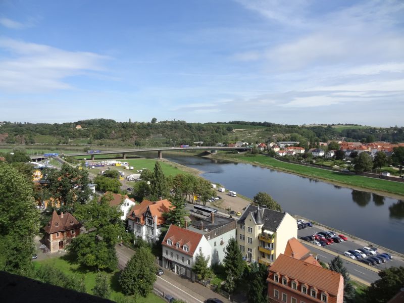 Abends fing es an zu stürmen und es kam auch ein Gewitter auf. Über Nacht regnete es dann aber am nächsten Morgen war diese drückende Schwüle vorbei und es wurde wieder schön. Jetzt machten wir uns nach dem Frühstück auf den Weg nach Königstein.Stellplatz in Königstein Camping am Treidlerweg Hier wollten wir den Campingplatz Königstein aufsuchen, aber ein kleines Schild an der Zufahrtsstraße zum Campingplatz führte uns auf einen wohl recht neu angelegten Wohnmobilstellplatz „Camping am Treidlerweg„. Hier bekamen wir einen sehr schönen Stellplatz direkt an der Elbe. Elbe bei Stellplatz KönigsteinAuf der gegenüberliegenden Seite konnte man den Lilienstein sehen und die Festung Königstein war auch in Sichtweite. Hier wollten wir hin. Wir gingen also zum Ort Königstein (Fußweg etwa 2 km) und fanden dort die Haltestelle um mit einem Touristenbus nach der Festung zu kommen. Bus zur FestungFür einen Fahrpreis von 4 Euro hin bzw. 5 Euro hin- und zurück ließen wir uns zur Festung fahren. Kurz vor der Festung mußte man noch einmal in eine kleine Bahn umsteigen um bis ganz nach oben zu kommen. An der Umsteigestation ist ein Parkhaus für Pkw`s, und neben diesem Parkhaus ist eine Parkspur für Wohnmobile. Wir hätten also auch mit dem Wohnmobil zur Festung hochfahren können. Weiter ging es mit dem Zug bis zum Eingang der Festung. Ankunft bei Festung Königstein Es gibt mehrere Möglichkeiten in die Festung zu gelangen; aber der auf dem Bild zu sehende Aufzug war gesperrt, so gingen wir erst einmal den Schildern nach zum Innenaufzug und kamen im Inneren der Festung heraus. Über einen steilen Tunnel, der auch einige Aufgang zur Festung 2Sicherungsvorrichtungen enthielt (großes Falltor, Öffnungen für Steine abzuwerfen oder Anderes) kamen wir dann im oberen Teil der Festung an. Es ist schon eine gewaltig große Anlage und wir gingen erst einmal die Außenwege entlang um die Aussicht zu geniessen. Dabei kann man erkennen, wie der Bau der Festung auch hiAuf steilem Fels erbauter wieder die vorhandenen Felsen mit einschloß. Überall geht es steil nach Unten.Blick auf Elbe und Ort KönigsteinBlick ins Elbtal Damit eröffnen sich natürlich wunderschöne Ausblicke in die nähereUmgebung, wie hier z. B. zur Elbe bei Königstein oder in Richtung Dresden, das man bei klarem Wetter auch am Horizont erkennen kann.