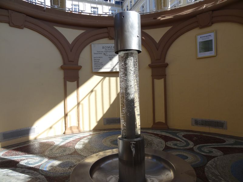 Vor dem Kurhotel ist die „Römerquelle“. Hier kann man von dem aus der Tiefe kommenden Mineralwasser kosten. Das Wasser ist aber mit 45° recht warm, Nach einiger Gewöhnung ist es aber doch recht köstlich.