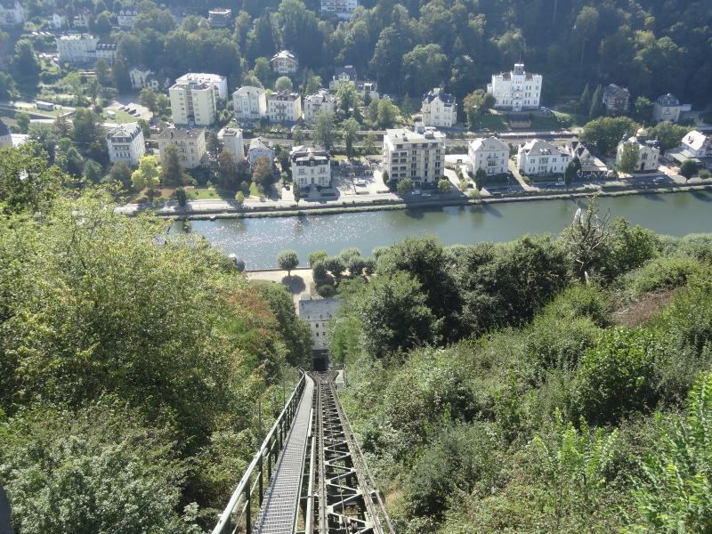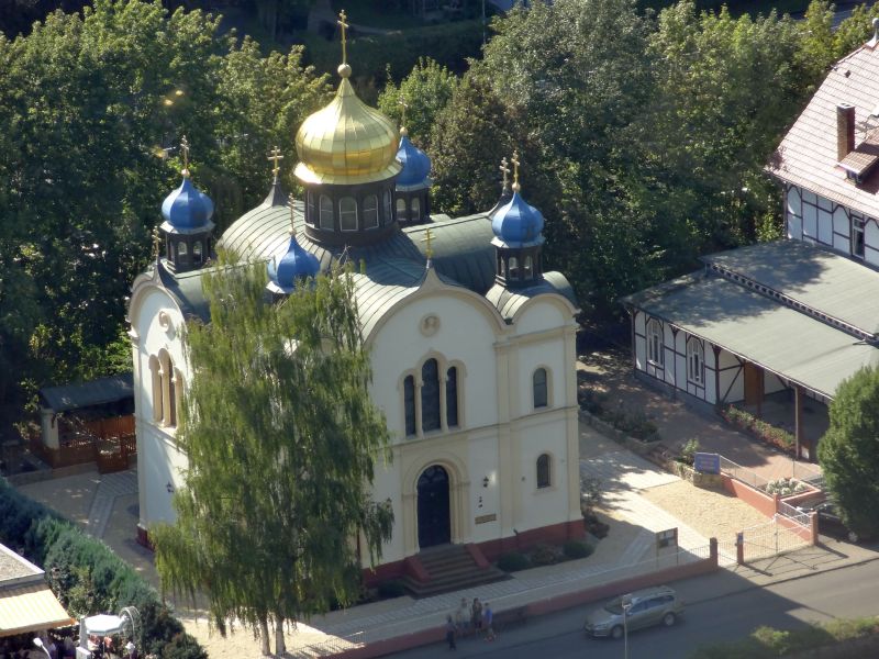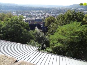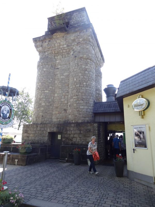 Wir gingen weiter, an der Spielbank vorbei zur Kurwaldbahn und fuhren mit dieser hoch zum Bismarckturm. Neben dem Turm war auch ein Café mit Außengastronomie. Von hier oben hat man einen sehr schönen Blick über Bad Ems. Man sieht u. a. die russisch-orthodoxe Kirche.