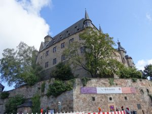 Am nächsten Tag fuhren wir weiter nach Marburg. Der Stellplatz liegt in unmittelbarer Nähe zu den Sportanlagen der Uni und nur wenige Schritte von der Lahn entfernt. Der Weg an der Lahn entlang führt direkt zur Brücke in die Altstadt. Diese wird wieder unterteilt in Unterstadt und Oberstadt. Von der Unterstadt aus kann man mit einem Aufzug in die Oberstadt fahren und kommt direkt am Marktplatz heraus. Wer den Aufzug scheut, kann über diverse Treppenausgänge oder dem Verlauf der Straße folgend in die Oberstadt kommen. Treppen sind jedenfalls in Marburg reichlich vorhanden. Hoch über Marburg liegt das Schloss, von dem man eine herrliche Aussicht über die Stadt hat. Marburg hat uns so gut gefallen, dass wir hier 2 Tage blieben.