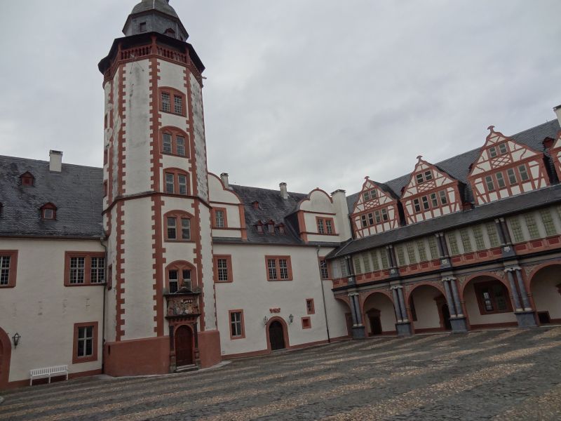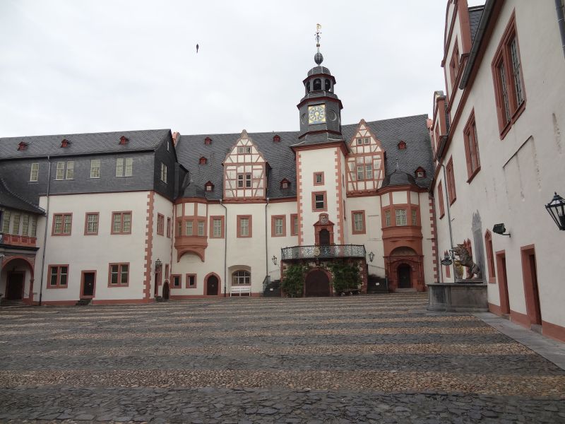 Weilburgin der AltstadtDas SchloßDas Schloß mit TurmDer SchloßparkDer Stellplatz in Weilburg ist ebenfalls ein großes geschottertes Gelände, direkt an der Lahn gelegen. Für den Stromanschluss und die VE-Station benötigt man einen Schlüssel, den man sich in der Touristeninformation holen muss, gegen ein Pfand von 15 Euro. Der Platz ist für ca. 100 Mobile ausgelegt. Als Toilette wird die gegenüber des Platzes im Feuerwehrhaus befindliche Einzeltoilette angeboten. Nachdem wir uns den Schlüssel besorgt und unser Womo am Strom angeschlossen hatten, gingen wir an der Lahn entlang zum Schloss und zur Altstadt.
